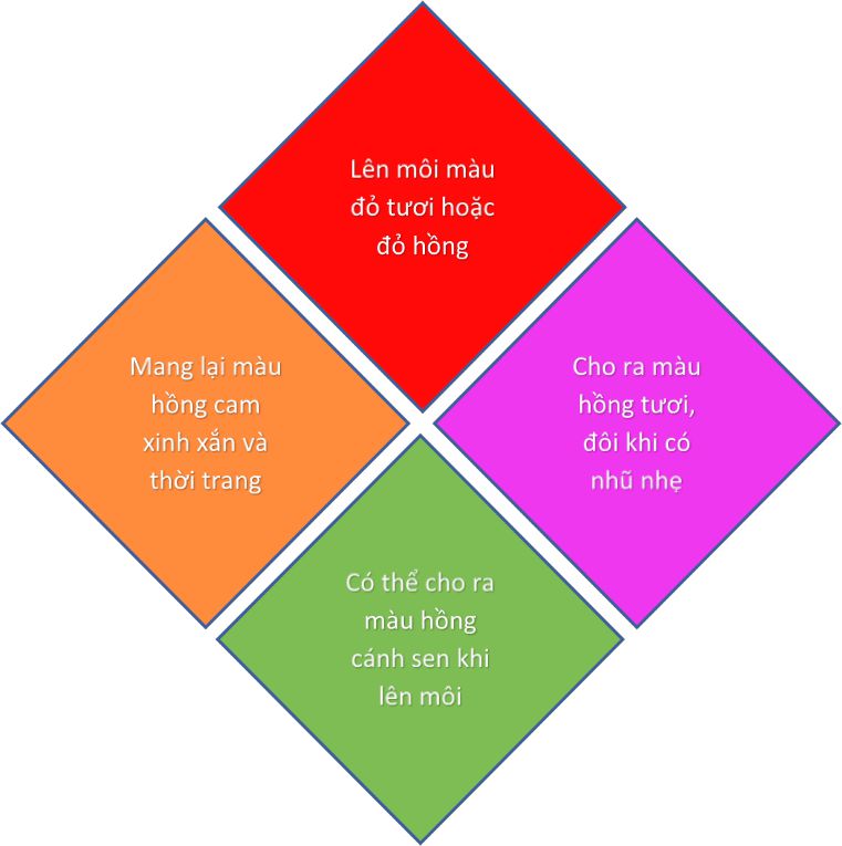 Mặc dù màu sắc cuối cùng trên môi phụ thuộc vào cơ địa mỗi người, một số màu son gió phổ biến khi thoa lên môi bao gồm :